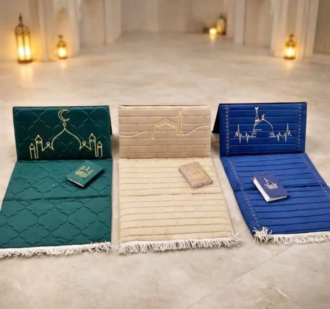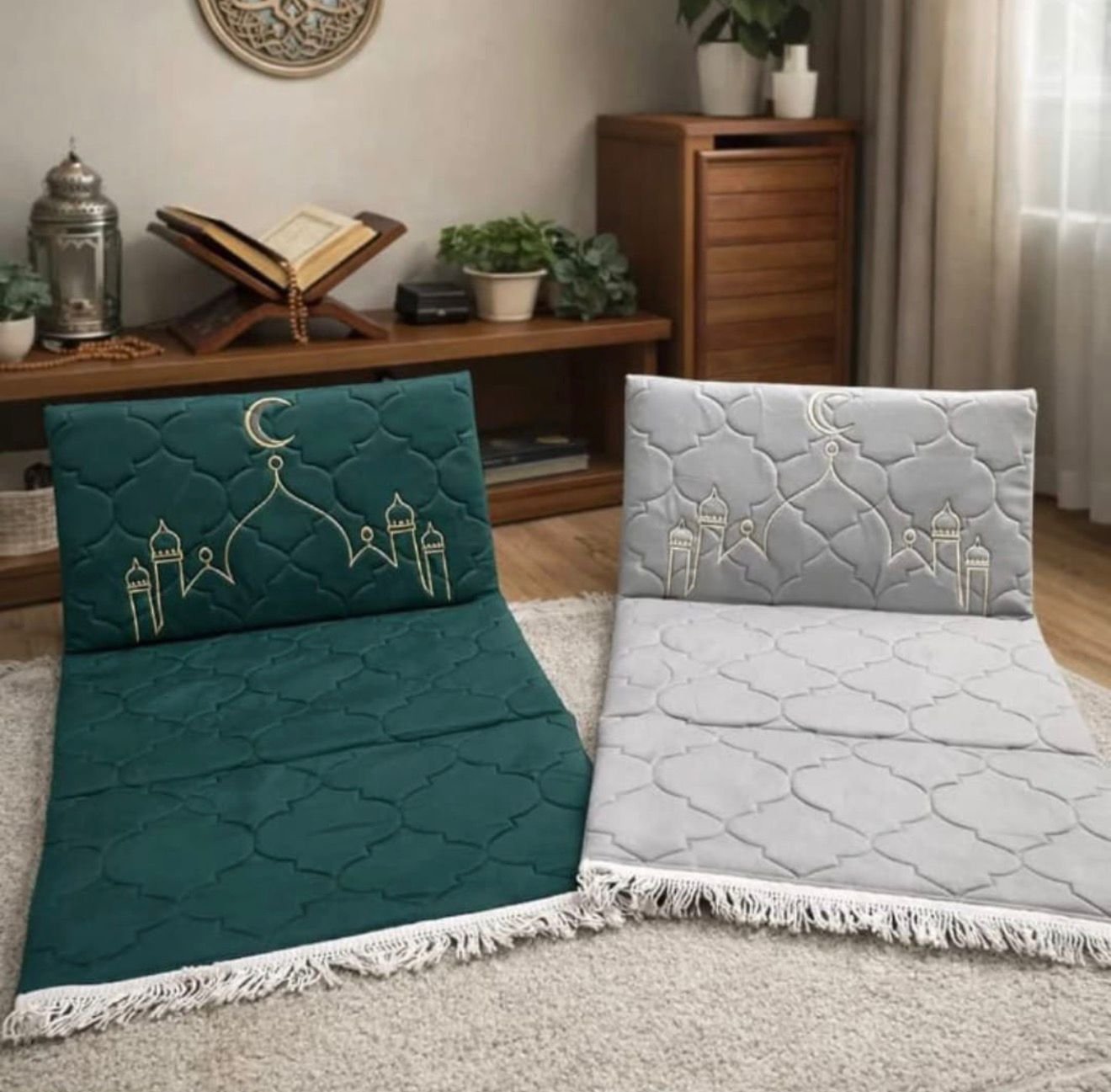 مصلية مبطنة بمسند قطيفة فاخرة – حفر ليزر أنيق | سجادة صلاة مريحة للظهر والركبتين
