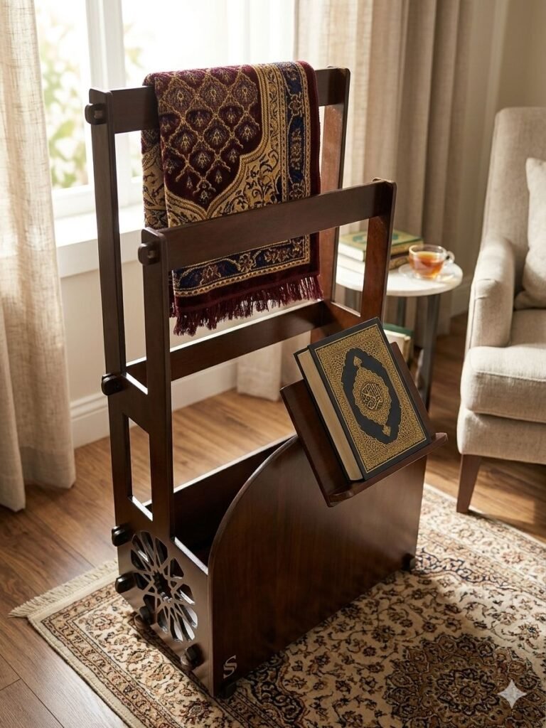 حامل مصحف عمودي لركن الصلاة – خشب محمل فاخر بتصميم كلاسيكي مع زخارف ذهبية | قابل لتعديل الارتفاع والزاوية | متانة استثنائية للمصاحف الكبيرة